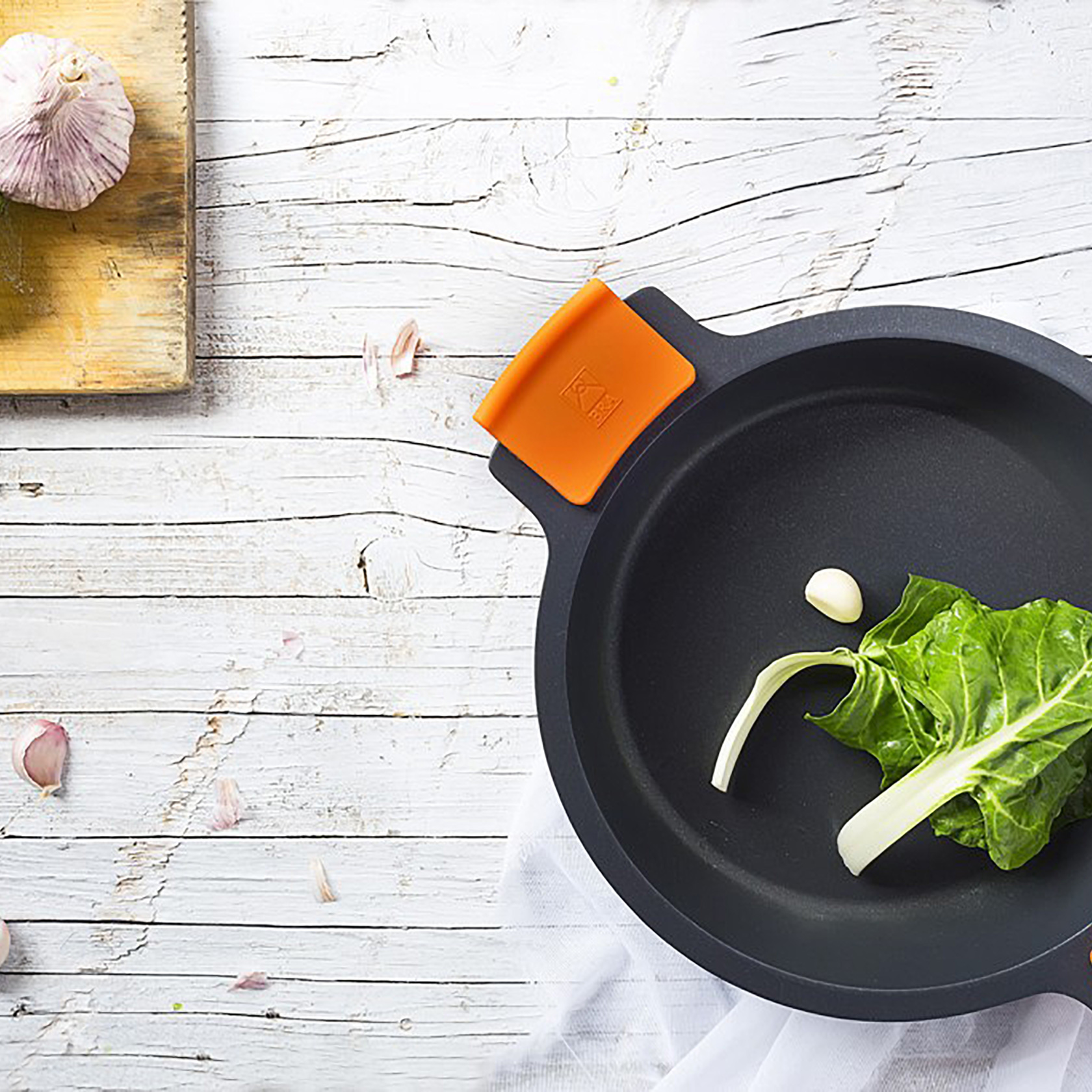Περιλαμβάνει καπάκι και δύο πορτοκαλί λαβές σιλικόνης για να κρατάτε την κατσαρόλα με ευκολία.