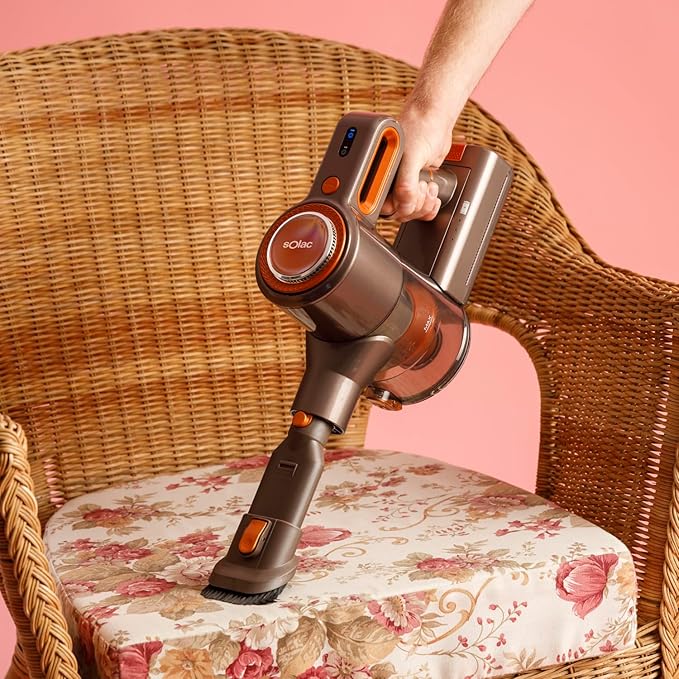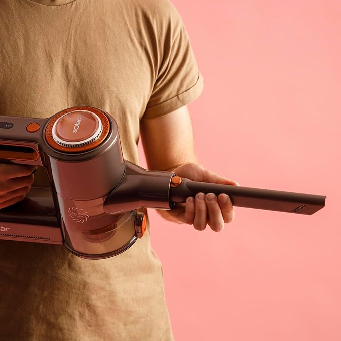 The Solac Turbobat Digital Flex 29.6V handheld hoover has a 200 W 110 AW digital motor that offers two speeds, eco and turbo. The suction capacity of this cordless hoover is 19,000 Pa, making it a powerful bagless hoover that sucks up dust with great efficiency, saving you from having to make multiple passes.