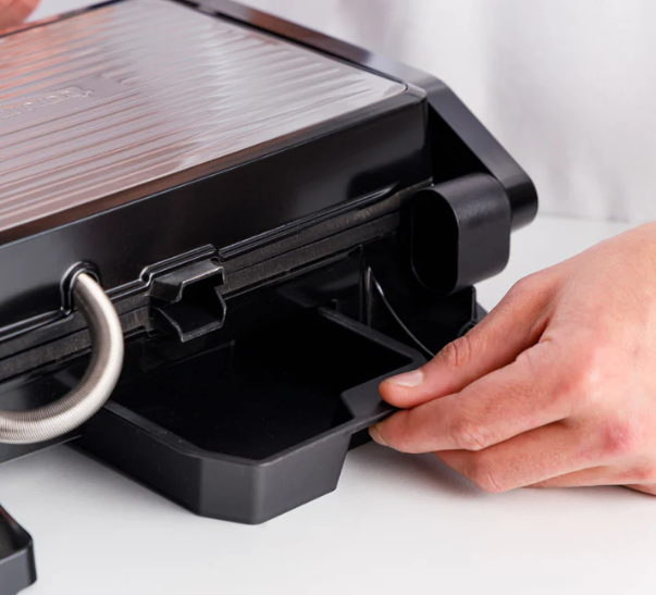 Το καπάκι, το οποίο προσαρμόζεται στο πάχος των τροφίμων, και ο πτυσσόμενος ανυψωτήρας επιτρέπουν την εύκολη αποστράγγιση του λίπους, εξασφαλίζοντας ομοιόμορφο ψήσιμο και λιγότερα λιπαρά στις συνταγές σας.