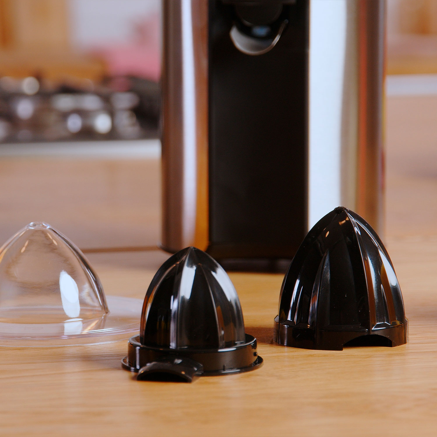 Περιλαμβάνει 2 αφαιρούμενους κώνους διαφορετικών μεγεθών για να ταιριάζουν σε μεγάλα και μικρά φρούτα, επιτρέποντας την αποτελεσματική και ομαλή εκχύμωση όλων των ειδών εσπεριδοειδών.
