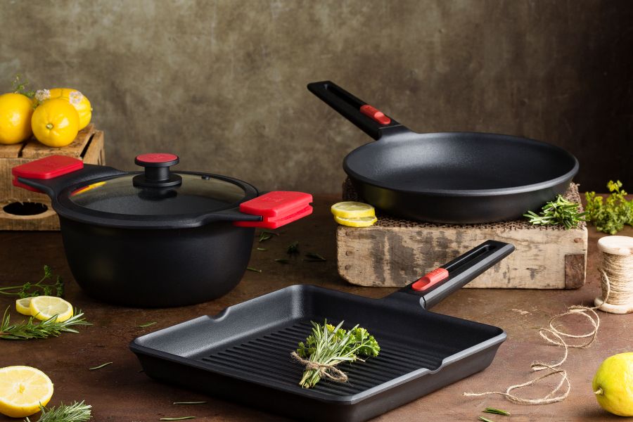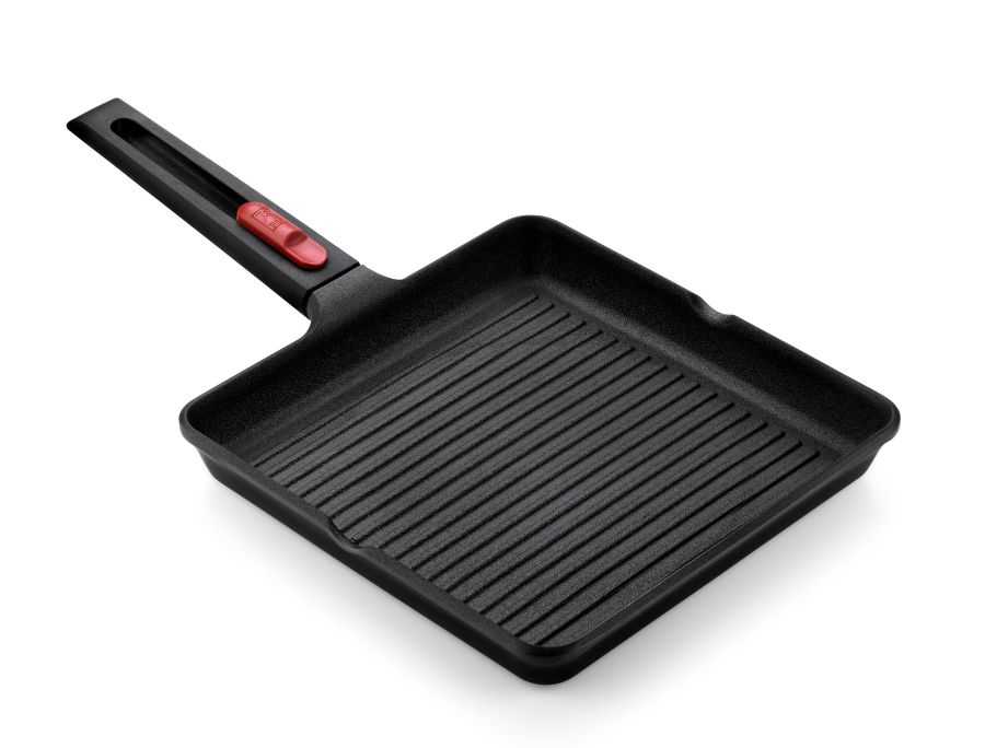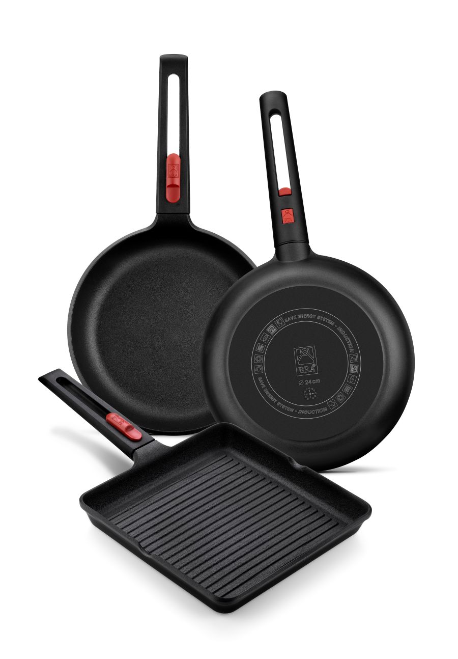 BRA's Infinity grill pan is made of 6 mm thick cast aluminium with three layers of durable PFOA free non-stick paint. The base is fully compatible with all types of hobs (gas, electric, ceramic, induction) and has a removable heat-resistant handle, ideal for use in the oven. It is durable, easy to clean and designed for demanding use.