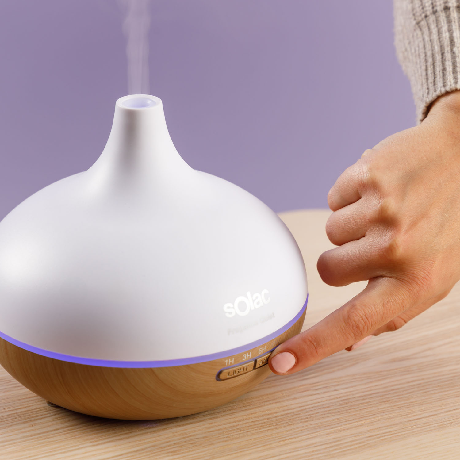 Διαθέτει δύο επίπεδα έντασης (15 ή 35 ml/h) ώστε να ρυθμίζετε την απόδοση ανάλογα με τις ανάγκες σας, καθώς και χρονοδιακόπτη για ακόμα μεγαλύτερη ευελιξία. Ο LED φωτισμός με 7 αποχρώσεις (γαλάζιο, μπλε, κόκκινο, ανοιχτό και σκούρο πράσινο, βιολετί και ροζ) δημιουργεί μια μοναδική ατμόσφαιρα, ιδανική για χαλάρωση.