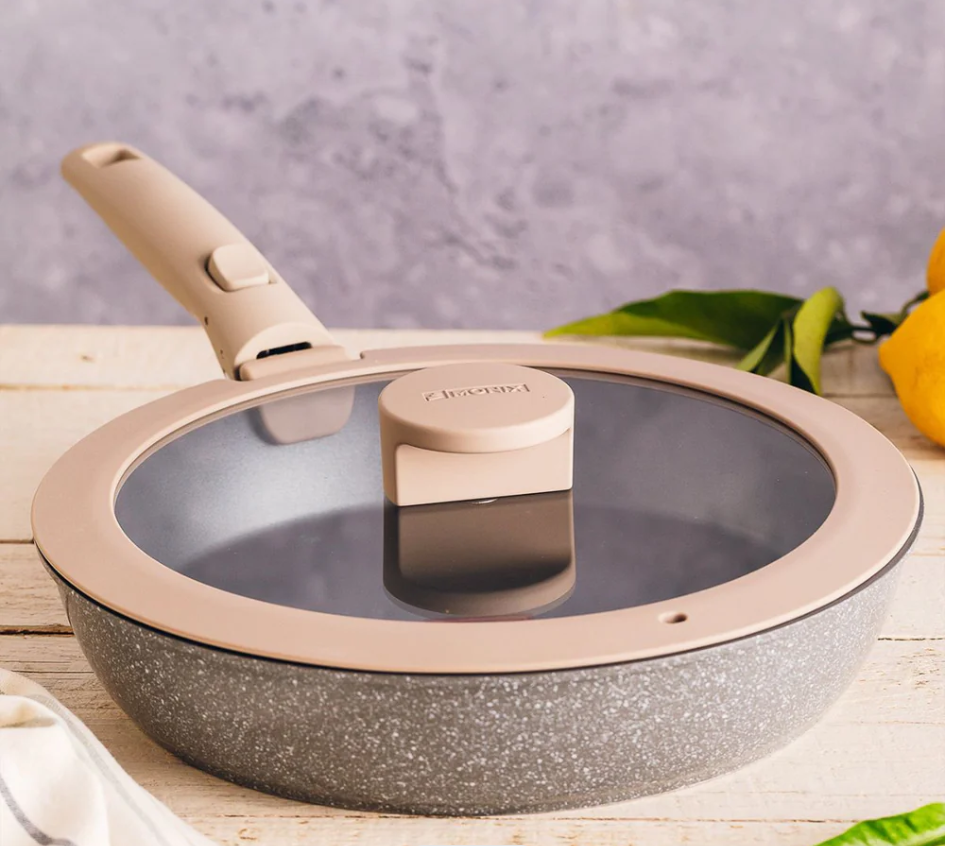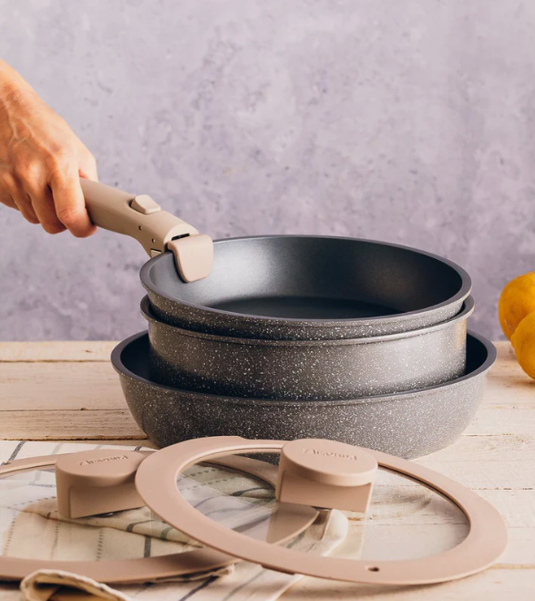 Το σετ Monix One Click Pietra (20-24-26 cm) αποτελείται από 3 αντικολλητικά τηγάνια από σφυρήλατο ανακυκλωμένο αλουμίνιο με αποσπώμενη λαβή, σχεδιασμένα για εξοικονόμηση χώρου, ασφαλές κράτημα και ομοιόμορφο μαγείρεμα σε όλες τις εστίες, με πρακτικό σύστημα στοίβαξης και ένδειξη θερμοκρασίας TherMonix για σωστό έλεγχο μαγειρέματος.
