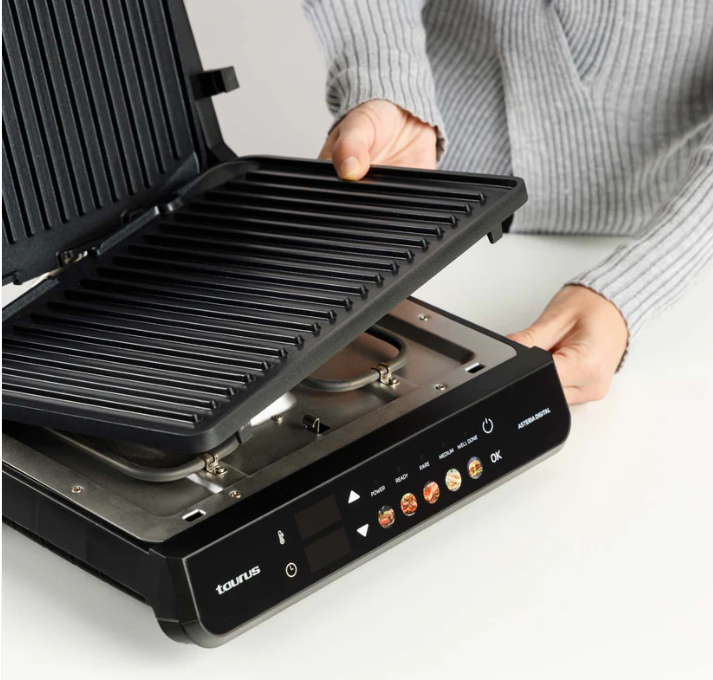 Το Asteria Digital της Taurus είναι ένα ισχυρό ηλεκτρικό grill 2000 W με έγχρωμη ψηφιακή οθόνη, 5 αυτόματα προγράμματα ψησίματος, 3 επίπεδα ροδίσματος και αποσπώμενες αντικολλητικές πλάκες XL 29 × 23 cm. Διαθέτει ρυθμιζόμενη θερμοκρασία, χρονοδιακόπτη αντίστροφης μέτρησης και σύστημα ρύθμισης ύψους πλάκας για ομοιόμορφο ψήσιμο κάθε τύπου τροφίμου με ακρίβεια και ευκολία.